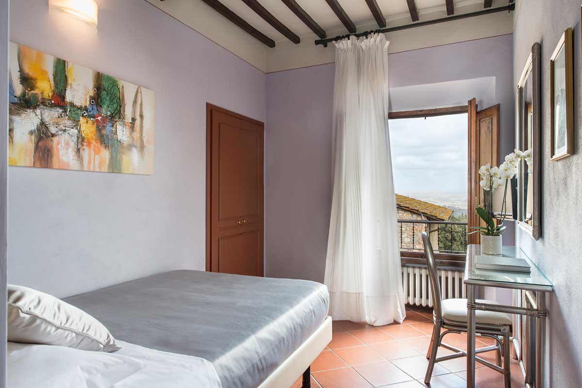Perfetta per chi viaggia da solo, la nostra camera Singola offre un ambiente raccolto e rilassante. Il letto comodo e l’affaccio sul verde regalano momenti di quiete nel cuore di San Gimignano.